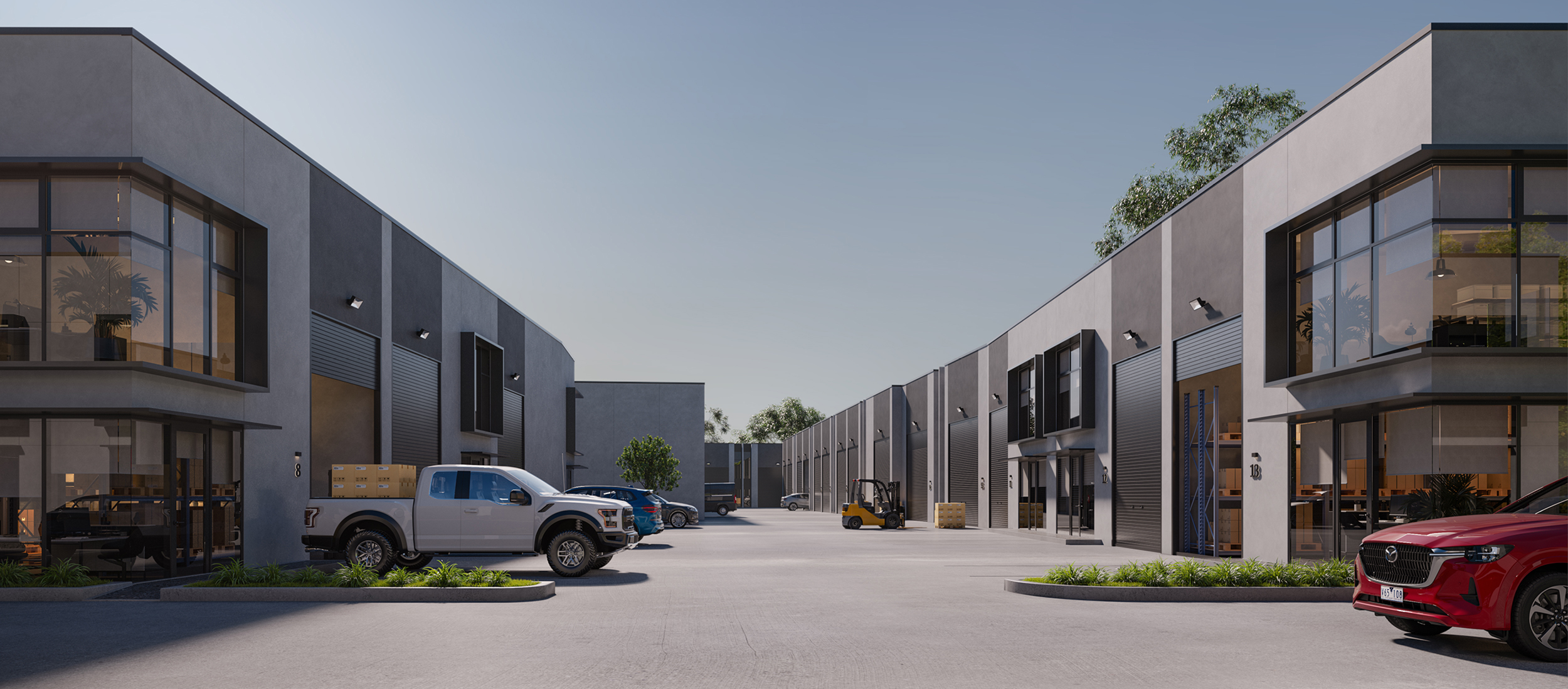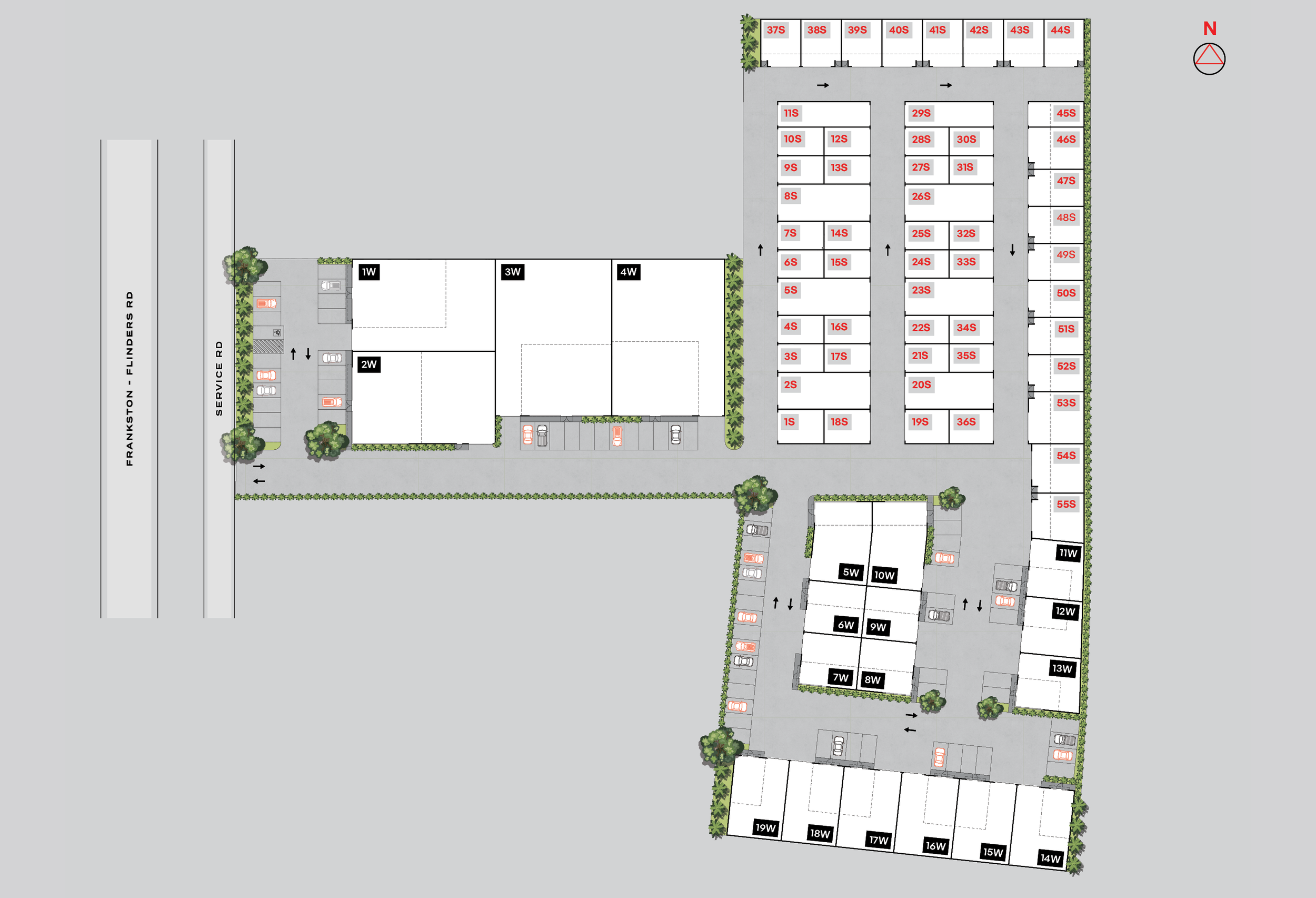 Showroom Warehouses line Frankston-Flinders Road for top exposure, with warehouses and storage units arranged behind in clear, secure zones. One gated entry, wide internal roads and a truck-turn bay keep traffic flowing and loading simple.